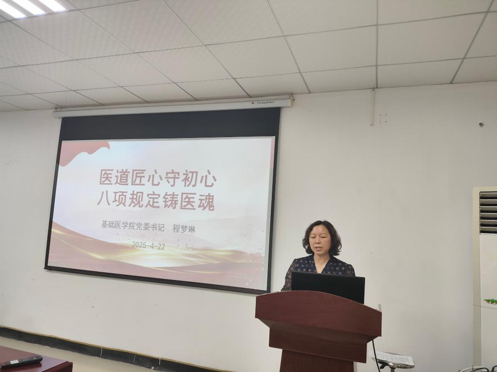 程梦琳为全体党员干部讲授了《医道匠心守初心,八项规定铸医魂》专题党课。她围绕“医者仁心”与中央八项规定精神内核的契合点,深刻阐述了中央八项规定对于回归“人民至上”执政理念的重要性。她指出,作为bv伟德国际1946的党员干部,要时刻以中央八项规定为尺,丈量初心纯度,校准行为准星。期间,她还通过生动的案例,警示大家要坚决抵制权力寻租与学术腐败,守护医者初心。