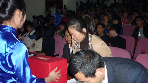 之后,工作人员放映一段来自马桥中学贫困员工生活与学习的短片。全体师生紧盯大屏幕,感受至深,对马桥中学贫困员工充满了同情。此时公司党总支范彬书记、学工办主任王淑华、副主任周立勇率先慷慨解囊向马桥中学贫困员工捐献爱心。随后一张张带着希望的捐款融入了充满爱心与希望的募捐箱里。范杉书记为11级临床医学本三班颁发了“优秀组织奖”并发表了讲话。范彬书记高度评价了此次主题晚会的重要意义,并表达了对马桥中学贫困员工们深切的祝福与愿望。学工办王淑华主任也清唱了一段经典的《女驸马》,寄予马桥中学贫困员工们衷心愿望。最后,晚会在充满爱心与希望的手语《和你一样》中落下帷幕。