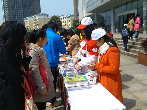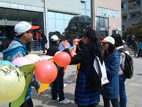 接近上午最后的下课时间,同学们陆陆续续的来到食堂吃午饭,在食堂正门口,两位志愿者正拉着系有彩色气球的宣传幅大喊着”吃光的是盘子,净化的是心灵”的宣传标语,吸引同学们前来围观。部分志愿者潜入食堂内,看见饭后端有比较干净盘子的同学就会奖与一个小气球,而领了气球的同学便可以凭气球在活动现场任选一本书。其实这些书也是从即将毕业或考研的学长学姐那回收来的,也算是充分利用资源。