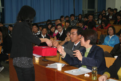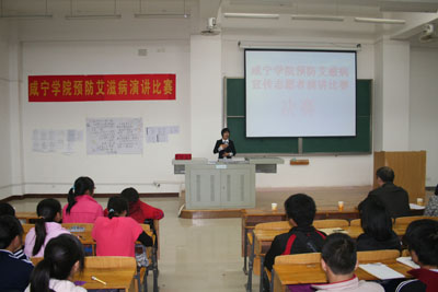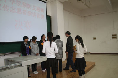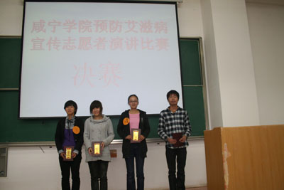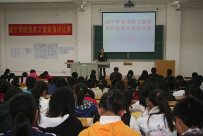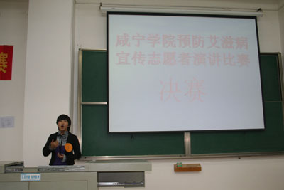 2010年11月2日19:00,咸宁公司中心校区5-501教室里气氛紧张而激烈,原来在这里进行的是预防艾滋病宣传志愿演讲比赛决赛的现场。经过初赛和复赛,10名选手进入了决赛环节。