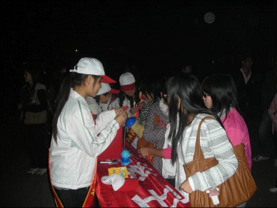 白天,志愿者们在温泉街区以及咸宁公司校内进行积极宣传,发放“预防艾滋病”的小册子。晚上,在公司西区进行募捐义卖活动,红蜡烛围成“红丝带”倍感温馨,露天播放的公益短片感人肺腑,小小的红丝带传递爱的温暖,众人横幅签名活动展示爱的力量。最后,bv伟德国际1946全体志愿者在烛光中进行宣誓,活动在全体合唱“让世界充满爱”中圆满结束。
