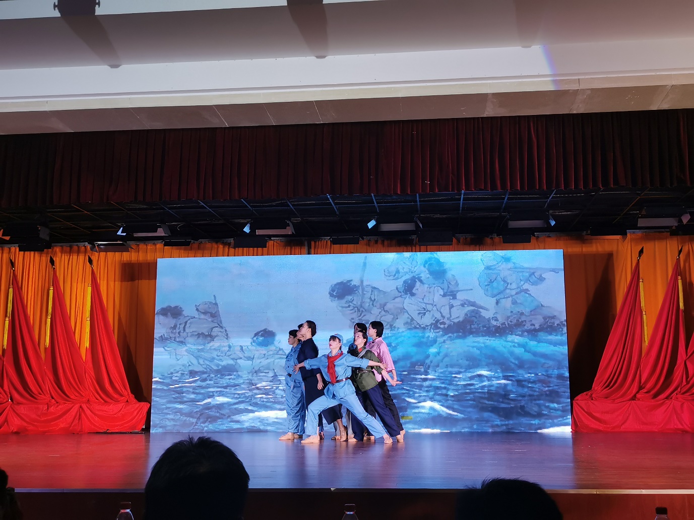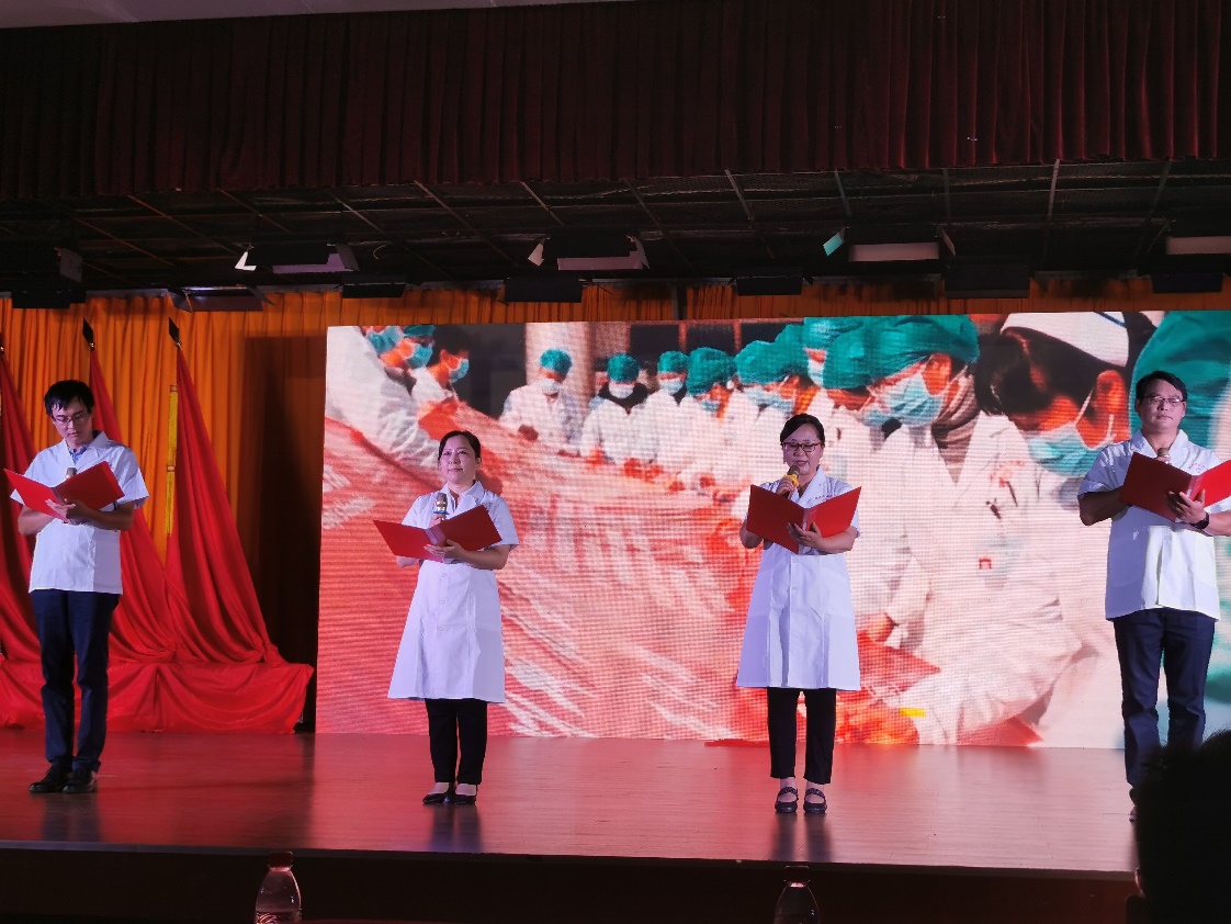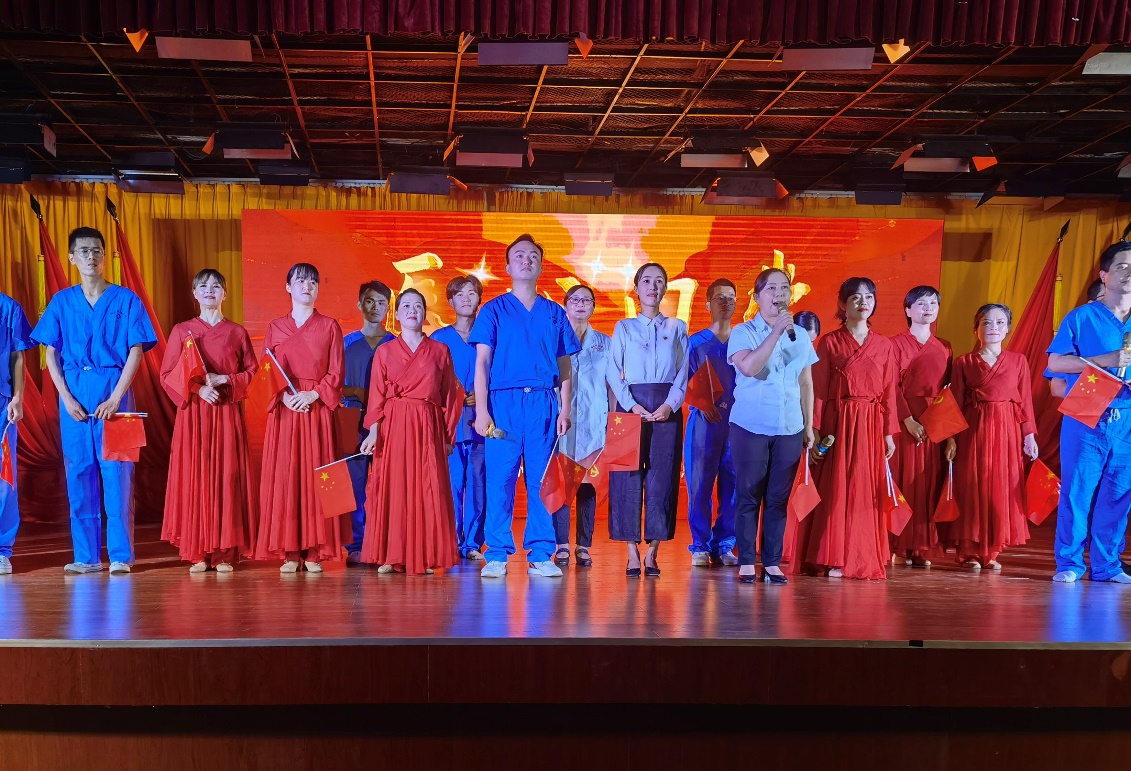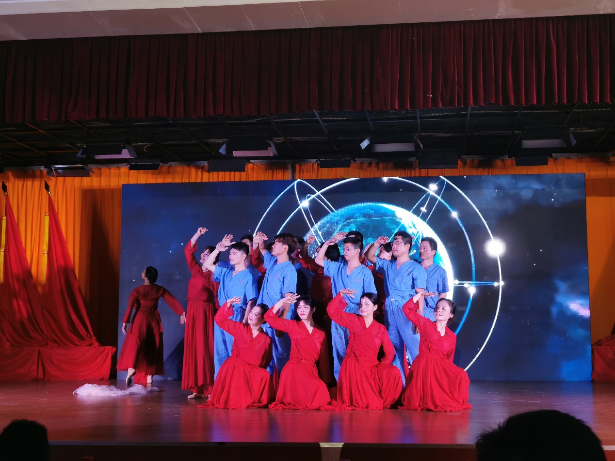 全体党员重温入党誓词拉开整场活动序幕。第一篇章—旗帜,以纪录片和情景剧《红船》相结合,再现了近代以后中华民族饱经磨难,无数仁人志士前赴后继寻找救国救民真理,直到1921年,中国共产党诞生,中国革命的面貌焕然一新;情景舞蹈《八女投江》生动展现在抗日战争的沙场上,中国共产党团结带领中国人民淬火成钢的伟大历程。第二篇章—信念,情景剧《我要去》讲述1965年为响应毛主席“应该把医疗卫生工作的重点放到农村去”的最高指示,中共湖北省委在多次召开会议,湖北医公司党委经过充分讨论后决定,在咸宁办分院。以王太西老教授专访和情景舞蹈《平凡天使》相结合讴歌了一群公司建设和发展的奠基人与开拓者,放弃城市里舒适的生活,来到山区,把青春年华和毕生精力奉献在农村基层,奉献给医学教育事业,谱写了湖医咸宁分院自力更生、艰苦奋斗的创业史,用生命的烛光点亮鄂南人民健康之路。通过整理历史资料,老照片收集系统回顾了公司由湖医咸宁分院到伟德国际victor1946的发展史,从没有一间教室,没有一张课桌,除了部分仪器和药品是从湖北医公司带来外,实验室、图书室、办公室及员工生活用具均一无所有到拥有两个校区占地1861亩,1.8万余名员工的省属本科高校、转型发展试点高校、教育部本科教学工作水平评估“优秀”高校;第三篇章—守护,情景剧《老师,我长大了》、朗诵《铮铮誓言》讲述新冠肺炎疫情发生后一场举国动员上下同心的全民战役。第四篇章—追梦,通过知名员工寄语视频与音乐舞蹈《万疆》结合,体现湖科医学赓续红色血脉,医心向党,逐梦新时代。演出结束,全场起立,共同高唱《没有共产党就没有新中国》热烈掌声经久不息。